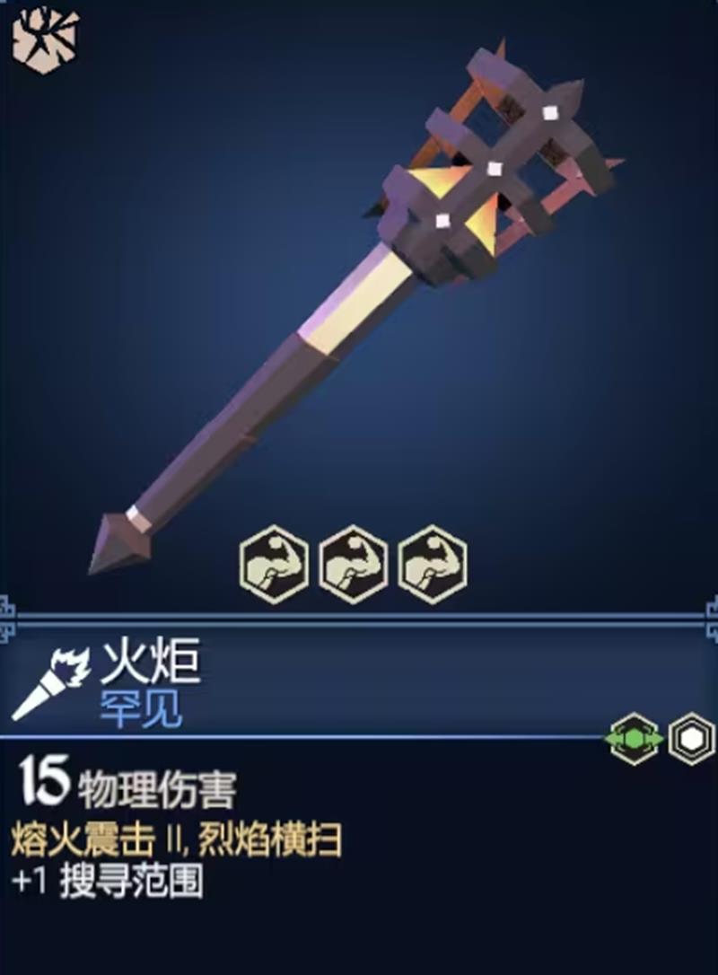 火炬作为蓝色品质的罕见武器,相比火把有了明显提升。它提供15点物理伤害,高于多数基础近战武器,同时具备两级震击与横扫能力。震击可在战斗中打断敌人动作,横扫则有助于应对多个目标。与火把相同,火炬也能扩展角色一格的搜索范围,在探索与战斗双重需求下表现稳定,适合中期继续沿用。
