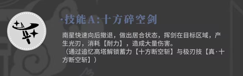 南星的一技能十方碎空剑具备独特的“聚合状态”机制。释放后她会向后撤退并进入专属增幅状态,在此期间挥剑可对周围区域造成光刃伤害。该技能消耗耐力较高,但输出表现可观。随着角色成长,可通过追忆高塔挑战解锁蓄力形态——十方断空斩,进一步提升技能爆发力与范围覆盖能力,增强清怪与Boss战中的实用性。
