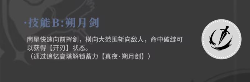 技能二为向前释放的横向大范围斩击,名为朔月剑。命中敌人破绽时可累积开刃状态,为后续技能增伤创造条件。该技能不仅具备良好的清线能力,还能在精准操作下触发额外机制。同样,通过追忆高塔提升技能等级后,可解锁更强力的蓄力效果,使南星在高阶内容中依然保有一定竞争力。