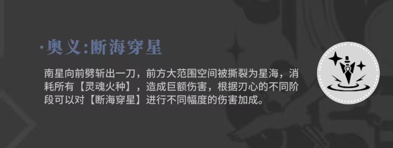 南星的大招为前向大范围斩击,撕裂空间形成名为星海的领域,消耗全部灵魂火种对范围内敌人造成高额伤害。该技能可根据刃心所处阶段强化效果,并提升断海穿星类技能的伤害数值。大招在团战或面对群聚精英怪时表现突出,配合合适的队伍配置可发挥更大战略价值。