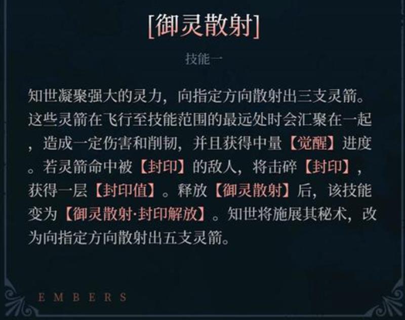 在普攻基础上,知世可通过蓄力改变技能形态。当以蓄力方式释放普攻时,会转化为驱秽技能,射出一支射程更远的箭矢,适合在安全距离打击远处目标。若敌人身上已累积三层封印,则可消耗这些层数将普攻转化为灵箭封印,该技能能对路径上的所有敌人造成多次伤害。敌人体积越大,受到的伤害越高,这使得知世在面对大型Boss或群怪时表现尤为出色。
