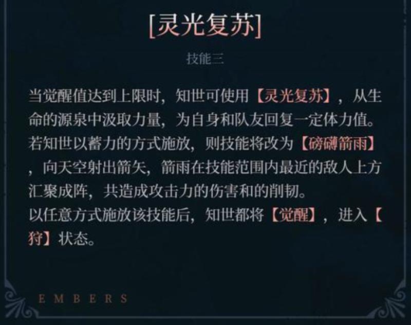 技能三为灵光复苏,需在觉醒值满时方可使用。该技能可为自身及周围队友恢复体力,具备一定的团队辅助功能。若在释放前进行蓄力,则会转化为磅礴剑雨,对范围内敌人造成持续阵法伤害,并附加削刃效果。该技能释放后会使知世进入觉醒状态,进而触发被动技能狩,形成技能联动,适合在团战或Boss战中作为起手技使用。
