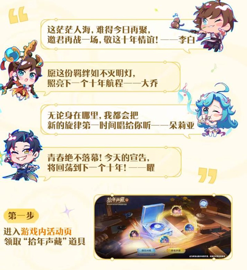 活动中包含了多位英雄的语音祝福,如李白的“这茫茫人海,难得今日再聚,邀君再战一场,敬这十年情谊!”、大乔的“愿这份羁绊如不灭明灯,照亮下一个十年航程”、朵莉亚的“无论身在哪里,我都会把新的旋第一时间唱给你听”以及曜的“青春绝不落幕!今天的宣告,将回荡到下一个十年!”等。