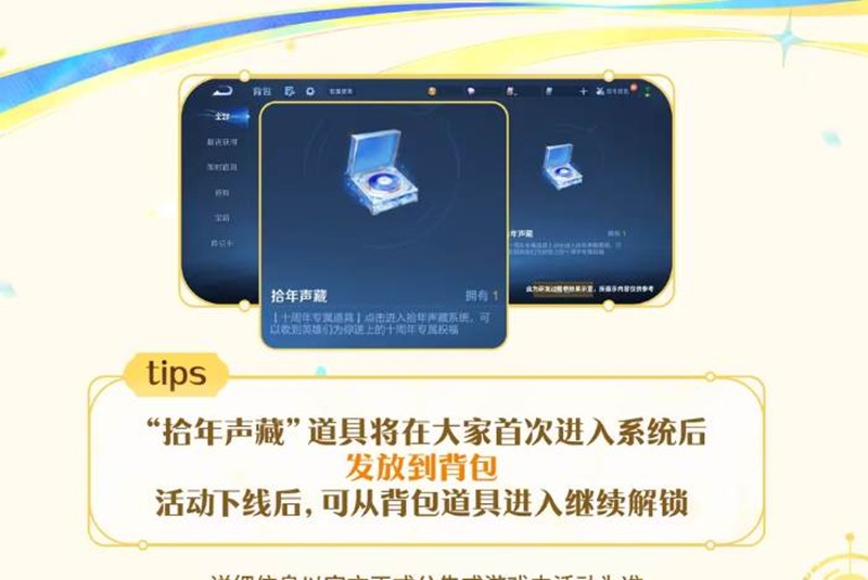 “拾年声藏”道具将在大家首次进入系统后发放到背包。活动下线后,玩家可以从背包道具进入继续解锁。