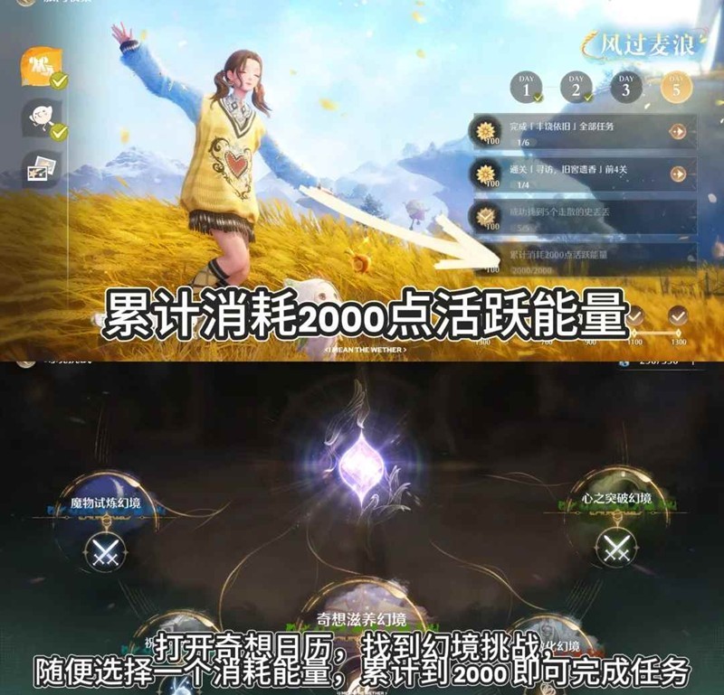 打开奇想日历,找到幻境挑战,随便选择一个消耗能量,累计到 2000 即可完成任务