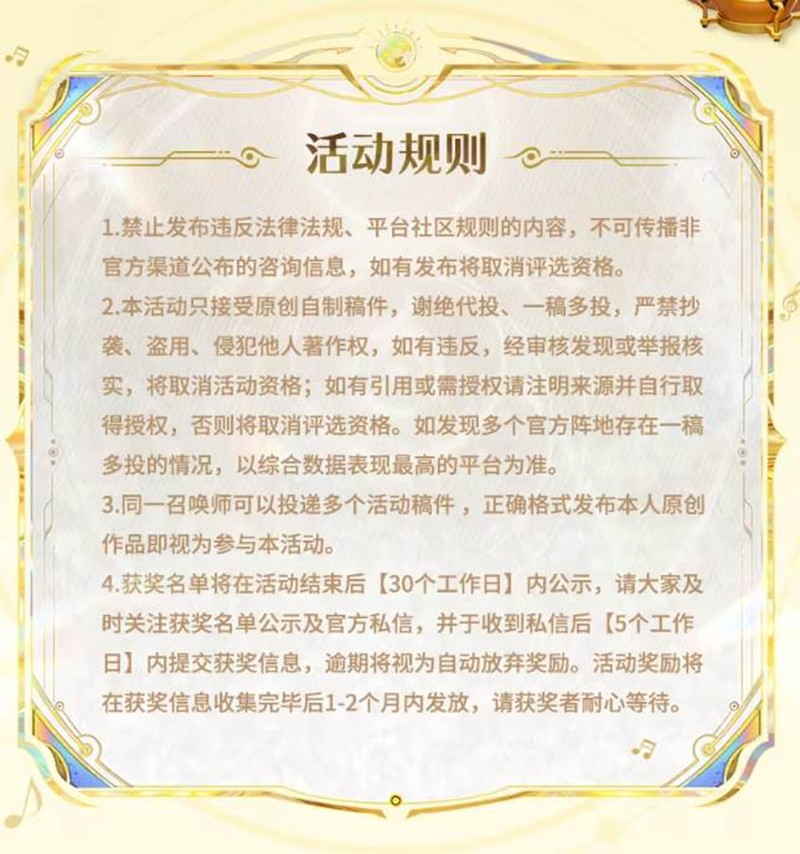 3.同一召唤师可以投递多个活动稿件,正确格式发布本人原创作品即视为参与本活动。