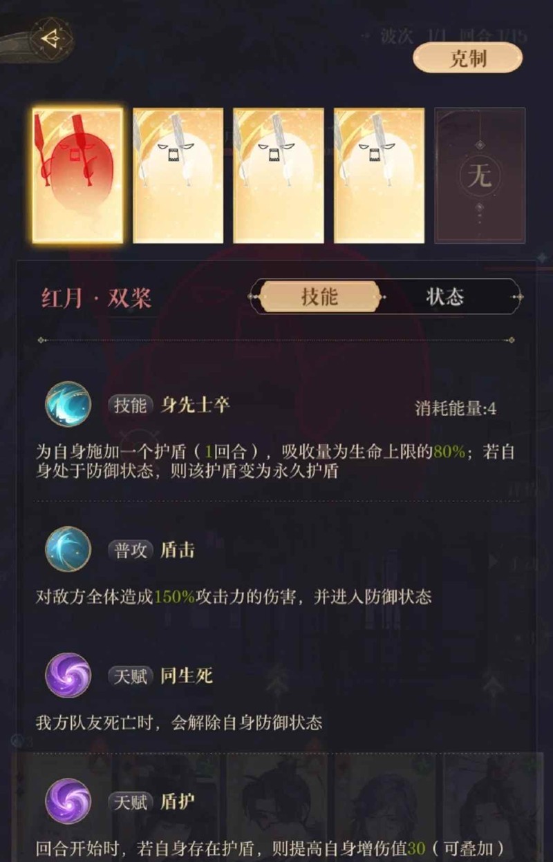 ●技能——不打人,只加盾(1回合)。处于防御状态,护盾会变成永久的。