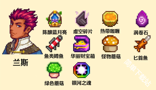2、兰斯:陈酿蓝月亮、虚空碎片、热带咖喱、涡卷石、鱼类鳟鱼、华丽财宝箱、怪物蘑菇、匕首鱼、绿色蘑菇、银河之魂