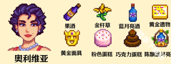 5、奥利维亚:果酒、金杆草、蓝月亮酒、黄金遗物、黄金面具、粉色蛋糕、巧克力蛋糕、陈酿蓝月亮