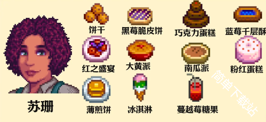7、苏珊:饼干、黑莓脆皮饼、巧克力蛋糕、蓝莓千层酥、红之盛宴、大黄派、南瓜派、粉红蛋糕、薄煎饼、冰淇淋、蔓越莓糖果