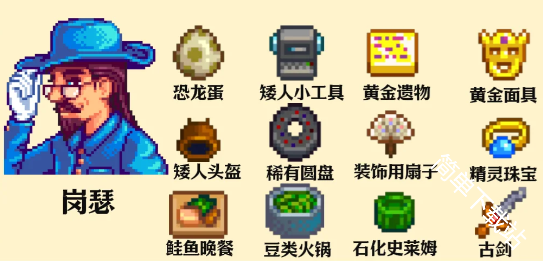 15、岗瑟:恐龙蛋、矮人小工具、黄金遗物、黄金面具、矮人头盔、稀有圆盘、装饰用扇子、精灵珠宝、鲑鱼晚餐、豆类火锅、石化史莱姆、古剑