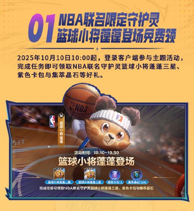 英雄联盟手游与NBA联动活动现已开启,为玩家带来全新的游戏体验。本次联动活动的第一波将于2025年10月10日10:00正式启动,届时玩家登录游戏客户端参与主题活动,完成相应任务即可免费领取NBA联名限定守护灵篮球小将蓬蓬三星、紫色卡包与集萃晶石等丰厚奖励。