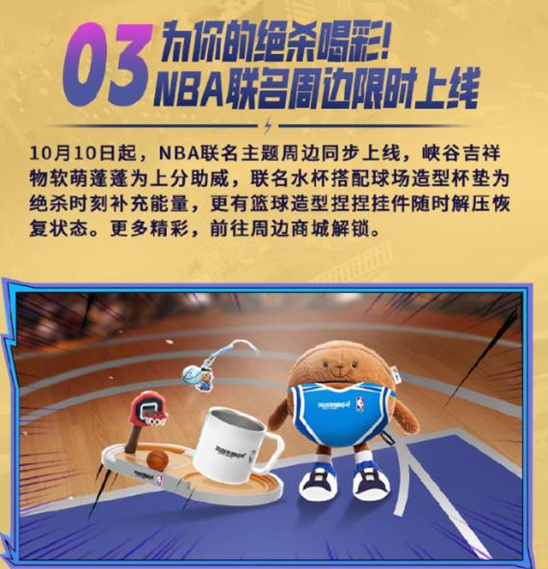从10月10日起,NBA联名主题周边也将限时上线。峡谷吉祥物软萌蓬蓬将为上分助威,联名水杯搭配球场造型杯垫为绝杀时刻补充能量,更有篮球造型捏捏挂件随时解压恢复状态。更多精彩内容,玩家们可前往周边商城解锁。