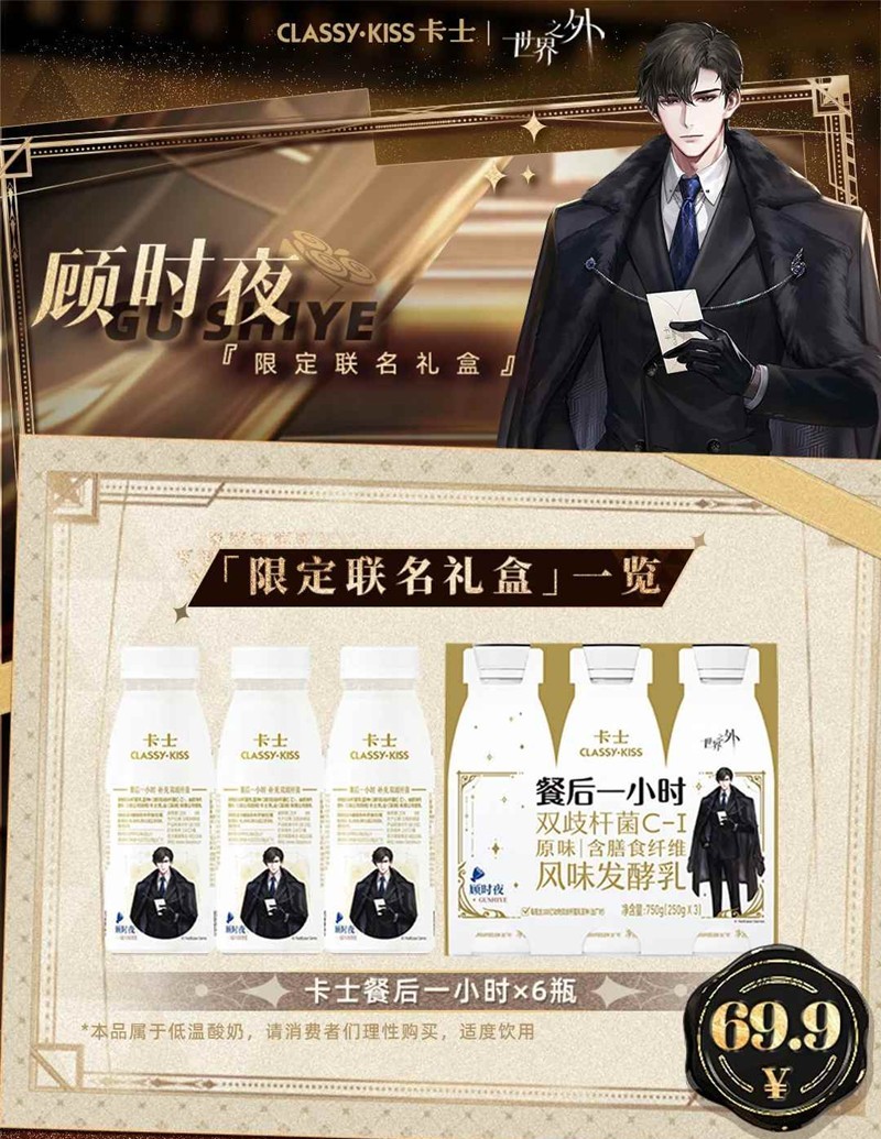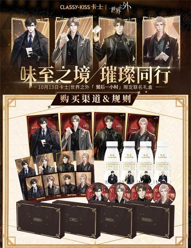 世界之外x卡士限定联名礼盒 将于10月13日开售,世界之外xCLASSYKISS卡士联动邀约,期待与你,共同品味……每款礼盒内含:「餐后一小时」联名酸奶*6,附赠对应男主个人周边礼盒*1、徽章*1、色纸*1、拍立得卡*1、镭射票*1,一起来和小编看看吧~