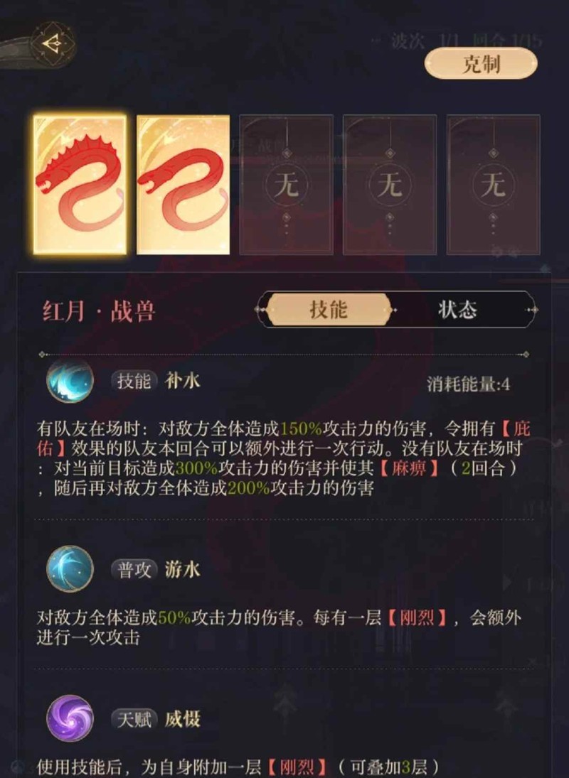 ●技能——①有队友,群攻+让(庇佑)队友额外行动一次。②无队友,高额单体+麻痹2回合,再群攻。