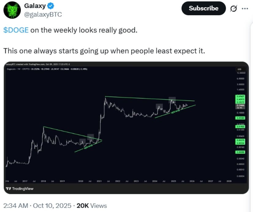 $DOGE周线图显示强劲看涨潜力,其上涨行情往往出人意料地启动。来源:Galaxy via X