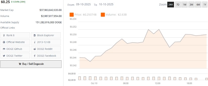 截至发稿,狗狗币交易价约0.25美元,24小时涨幅0.54%。来源:Brave New Coin
