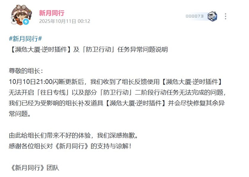 10月10日21:00闪断更新后,我们收到了组长反馈使用【濒危大厦·逆时插件】无法开启「往日专线」以及部分「防卫行动」二阶段行动任务无法完成的问题,我们已经为受影响的组长补发道具【濒危大厦·逆时插件】并会尽快修复其余异常问题。