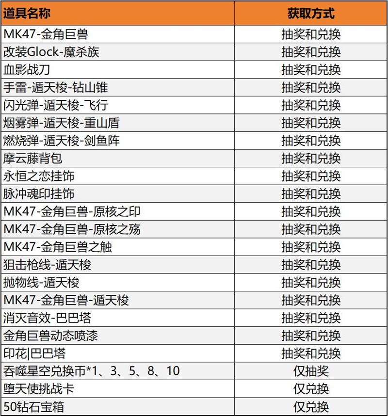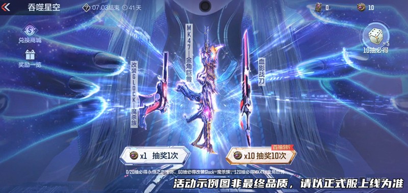 除了MK47-金角巨兽,改装GLOCK-魔杀族、血影战刀、手雷-遁天梭-钻山锥、闪光弹-遁天梭-飞行、烟雾弹-遁天梭-重山盾、燃烧弹-遁天梭-剑鱼阵等道具也将在吞噬星空夺宝中返场。其中,核心奖励MK47-金角巨兽120抽保底获得、GLOCK-魔杀族60抽保底获得。
