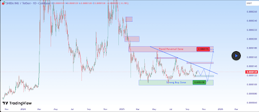 日线图技术分析表明,SHIB正重新测试2025年5月以来形成的宽幅下降通道中的关键强买入区。