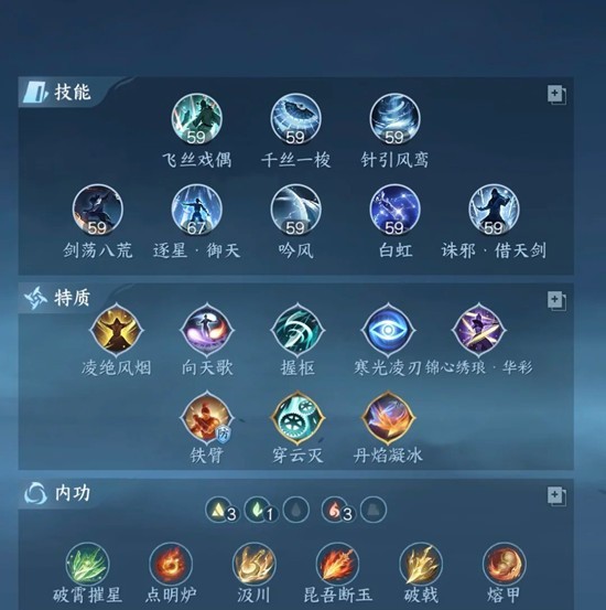 内功特质。照抄就行没有变化,神特换剑心+狂霆也试了,还是不如神特。更正一下,凤城特质带华彩更高,技能染什么颜色都行。