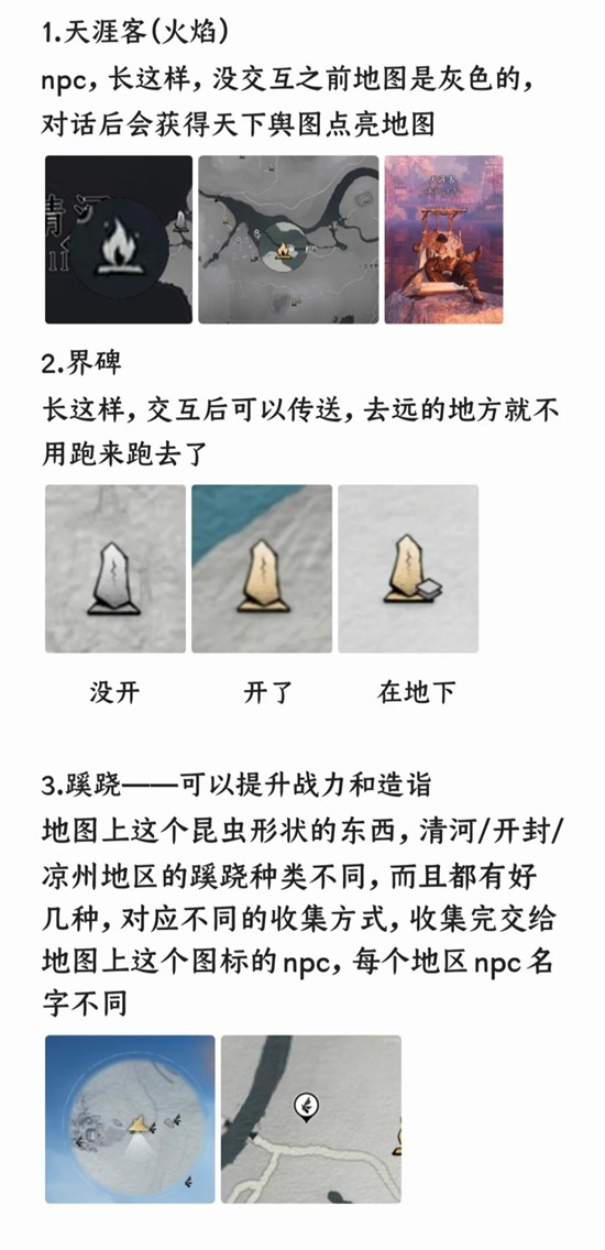地图上这个昆虫形状的东西,清河/开封/凉州地区的蹊跷种类不同,而且都有好几种,对应不同的收集方式,收集完交给地图上这个图标的npc,每个地区npc名字不同