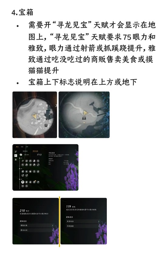 * 需要开“寻龙见宝”天赋才会显示在地图上,“寻龙见宝”天赋要求75眼力和雅致,眼力通过射箭或抓蹊跷提升,雅致通过吃没吃过的商贩售卖美食或摸猫猫提升