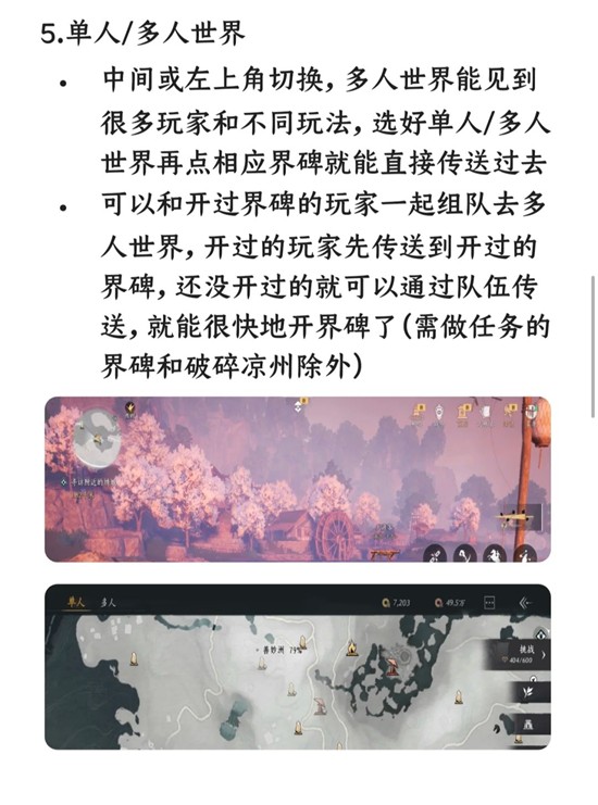 * 可以和开过界碑的玩家一起组队去多人世界,开过的玩家先传送到开过的界碑,还没开过的就可以通过队伍传送,就能很快地开界碑了(需做任务的界碑和破碎凉州除外)