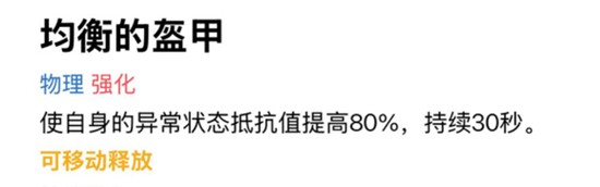 均衡的盔甲是剑星的核心防御技能之一,能够大幅提升角色对异常状态的抵抗能力,抵抗率提升高达80%,持续时间长达30秒。该技能在强化后,不仅可在释放时立即清除自身一个异常状态,还能让剑星在技能持续期间每次攻击附带一次爆炸效果,进一步增强了持续输出能力。这一机制让剑星在面对控制频繁的敌人时依然能保持稳定输出。