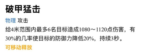破甲猛击是一项范围伤害兼减防技能,可对4米范围内的多个敌人造成1080至1120点伤害,并有30%概率降低目标20%的防御力。技能强化后,减防触发概率提升至50%,且命中后还能使剑星自身移动速度提高15%。这项技能在团战中尤为关键,不仅能打出可观AOE伤害,还能为队友创造更高的输出环境。