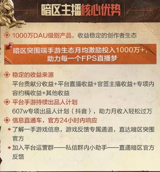 千万级激励:《暗区突围》端手游生态月均激励投入超过1000万+,助力每一个FPS直播梦。