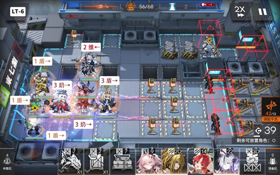 第二关:开局先放先锋在奶盾位,最上方补一个对空输出(不用叠很多层),再叠5层维配上下两个奶盾即可(有遥更好)。