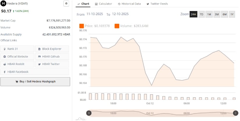 BraveNewCoin最新数据显示,Hedera现报0.17美元,24小时微涨1.65%。当前网络市值71.7亿美元,24小时交易量3.245亿美元,反映出活跃但谨慎的市场情绪。
