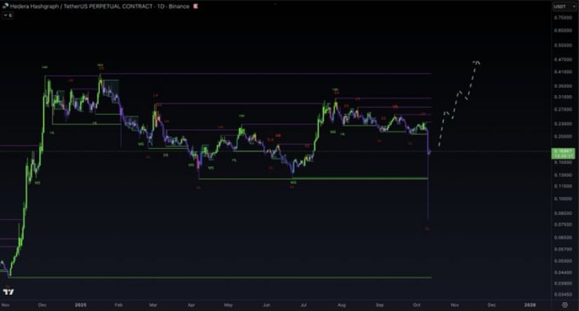 分析师Trade4ddict补充指出,HBAR在近期市场暴跌中"经历了剧烈调整",曾下探0.125美元低点后快速反弹。他强调需要出现日线级别阳线,且突破0.235美元前高,才能确认真正的看涨反转并有望冲击历史高点。