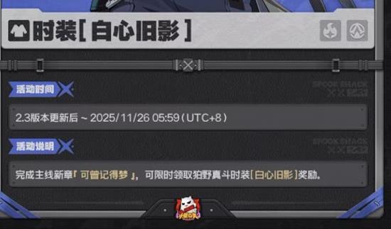 完成主线新章「可曾记得梦」,玩家将限时领取狛野真斗时装[白心旧影]。这款时装不仅设计精美,还带有独特的背景故事,是玩家们不容错过的收藏。