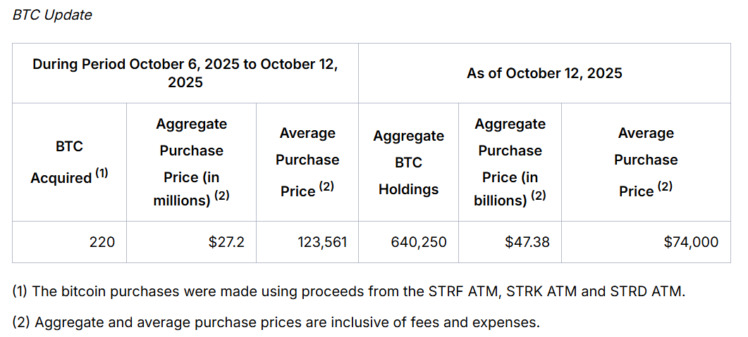 比特币储备公司龙头微策略(Strategy)于 10 月 13 日发布公告,宣布 10 月 6 日至 10 月 12 日期间,花费 2,720 万美元再次买入了 220 枚比特币,购买均价为 123,561 美元。