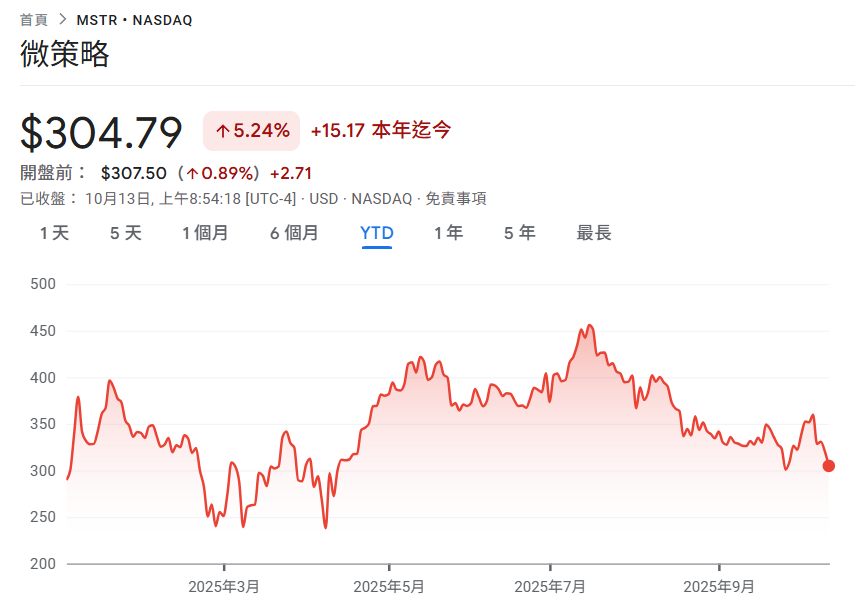 微策略股票 MSTR 在近 1 个月时间内波动剧烈,在 10 月初 MSTR 还曾一度冲上 360 美元,不过或许受 1011 加密市场大规模清算、比特币价格受挫影响,MSTR 目前股价已跌至 300 美元附近,市值也滑落至 875 亿美元。