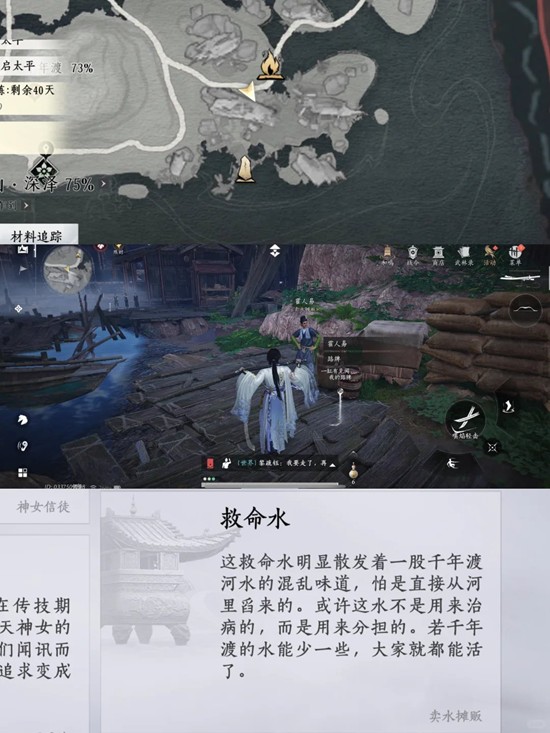 继续直走,遇到一个喊救命水的小摊贩,和他对话