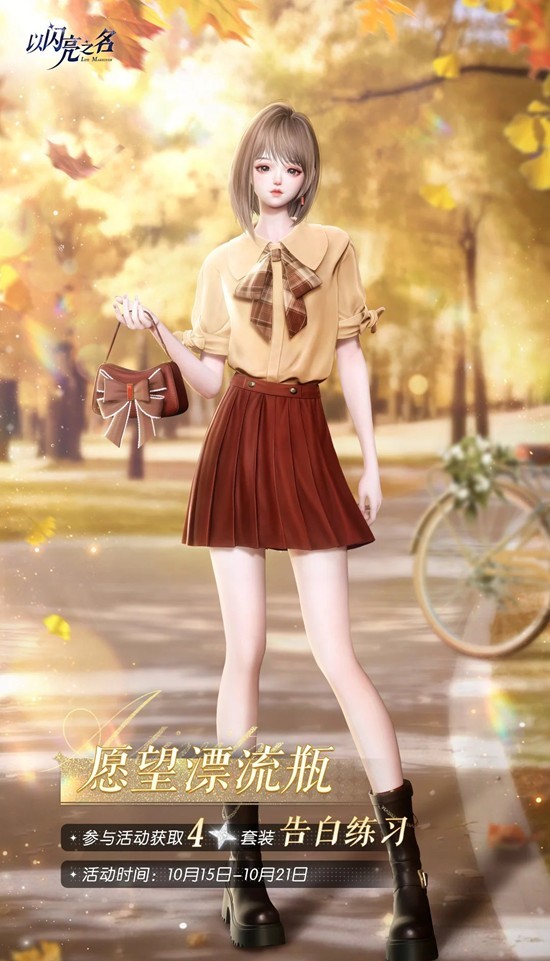 以闪亮之名愿望漂流瓶活动,可获得四星套装「告白练习」~10月15日-10月22日,累积心愿积分,可以获取四星套装【告白练习】、拍照相框【风格至上】、潮流色卡*13、绚梦邀请函及多种材料道具奖励!一起来和小编看看吧~