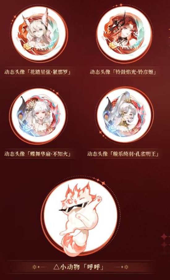 4款动态头像:「花踏星弦·紧那罗」、「铃鼓焰光·铃彦姬」、「蝶舞华扇·不知火」、「璇乐绮羽·孔雀明王」