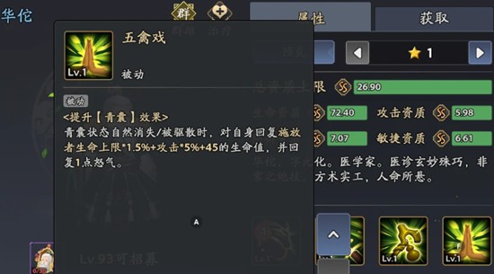 五禽戏是华佗的另一被动技能,与其特有的青囊状态紧密相关。当青囊状态结束时,华佗将获得1点怒气回复,随着技能等级提升,最高可达到50%的概率额外回复怒气。这一直接影响大招循环速度的机制,使华佗能够在战斗中更频繁地释放救世良方。同时,青囊状态本身也与多个技能联动,包括提升治疗量和复活概率。因此五禽戏不仅是续航保障,更是推动华佗技能循环的核心驱动力,建议在培养时优先升级。