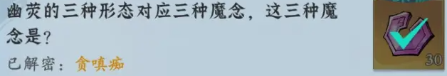 2、幽荧的三种形态对应三种魔念,这三种魔念是?贪嗔痴