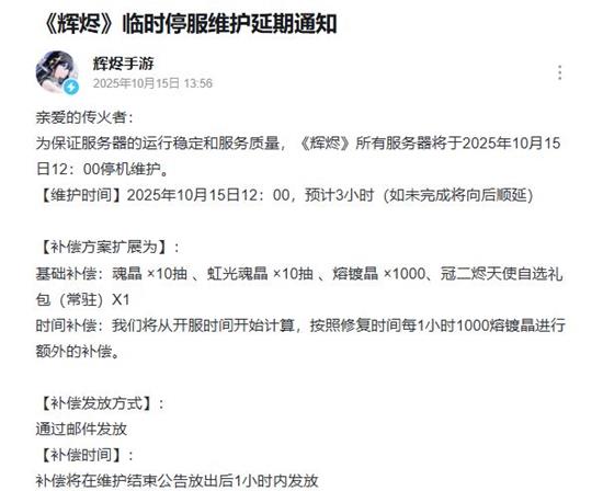 辉烬临时停服维护延期通知发布-所有服务器暂停机维护