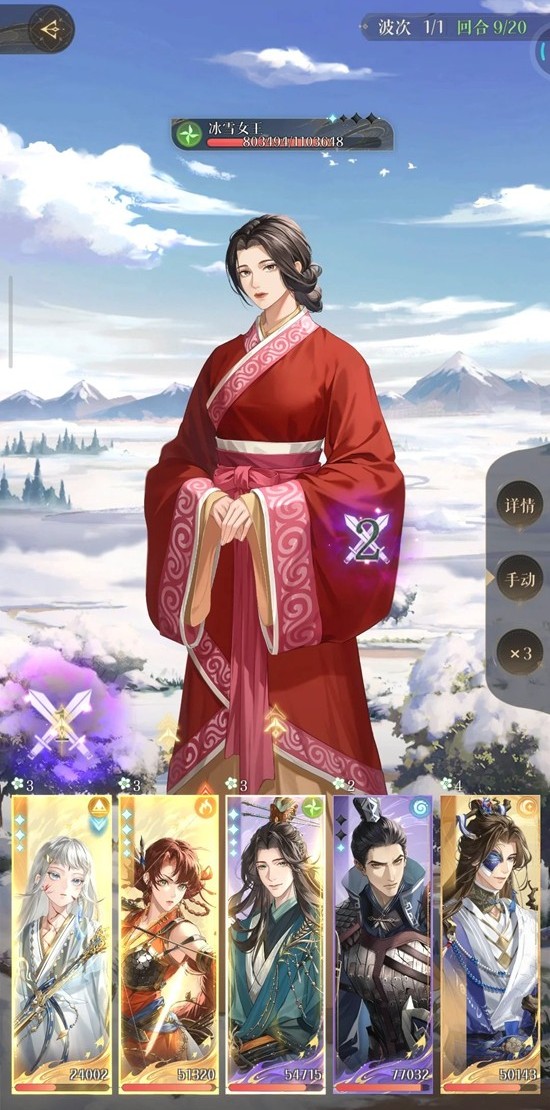 第十二回合 风女王开大回合手滑了(顺序点错了),风女王身上有红剑,颜良开大后风boss直接秒了他