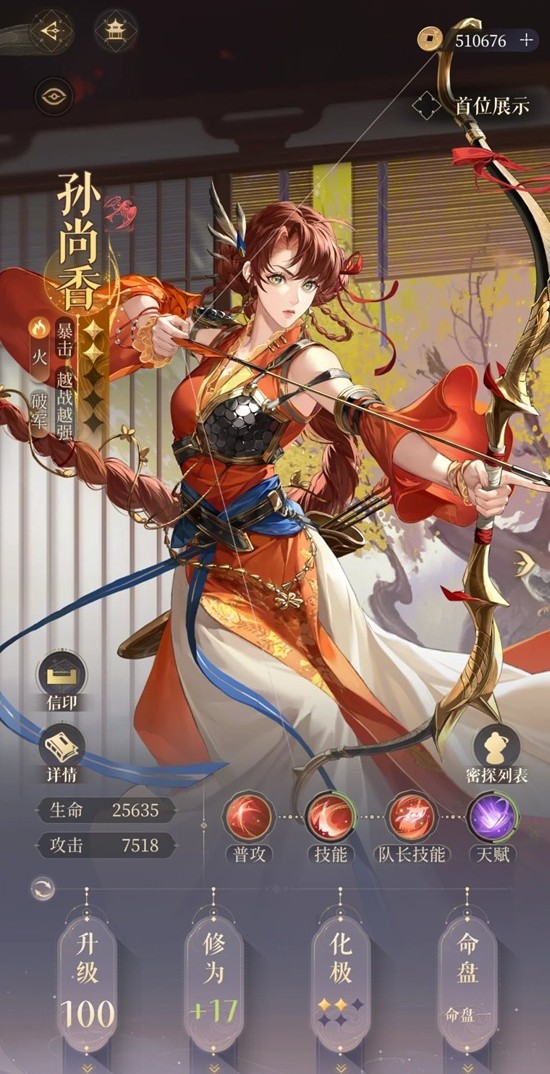 孙尚香命盘:暴击效果提升、技能中、初始能量+1(这个能量没有的话可能九回合不一定能结束水女王,可能要拖到十回合,不过也没关系)