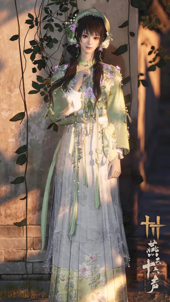 全新套装「惜芳时」的设计灵感来源于王维的诗句:“坐看苍苔色,欲上人衣来。”这套衣服以铁线莲的温柔蔓延为主题,翠叶层叠,花散清芬,仿佛将一个个煮茶听风的午后和推窗见山的清晨都融入其中。