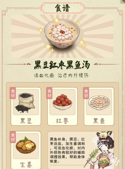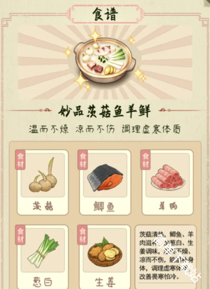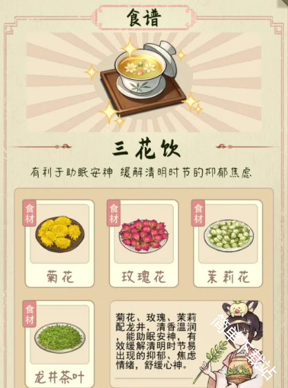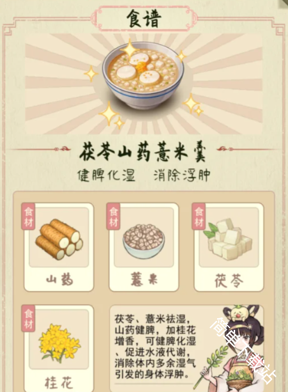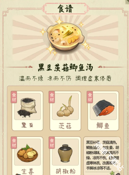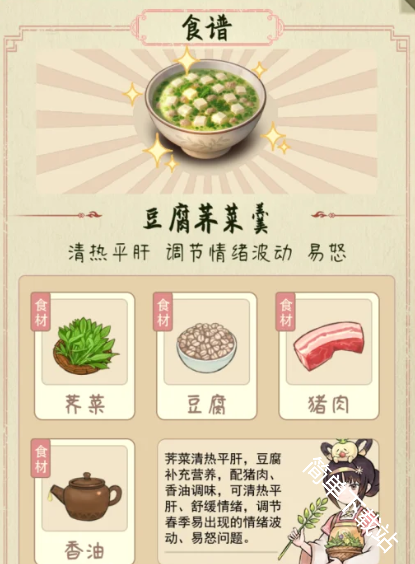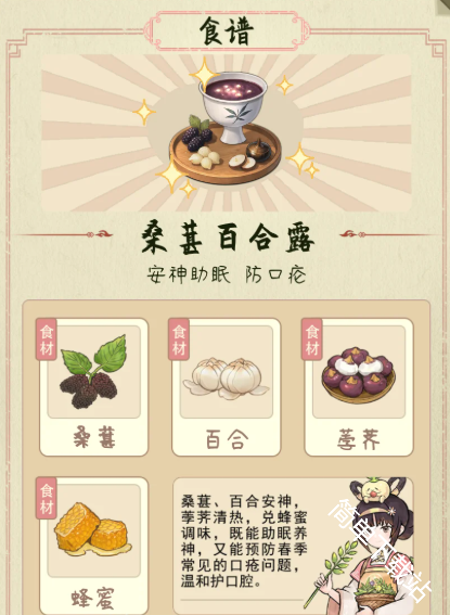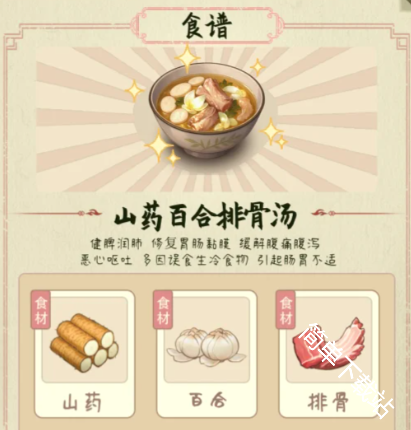 本草善食录中食物需通过各色材料来进行搭配制作,各个材料搭配制作后可合成出特色的食物。下方是目前游戏中已有的各种食物的食材搭配制作配方!