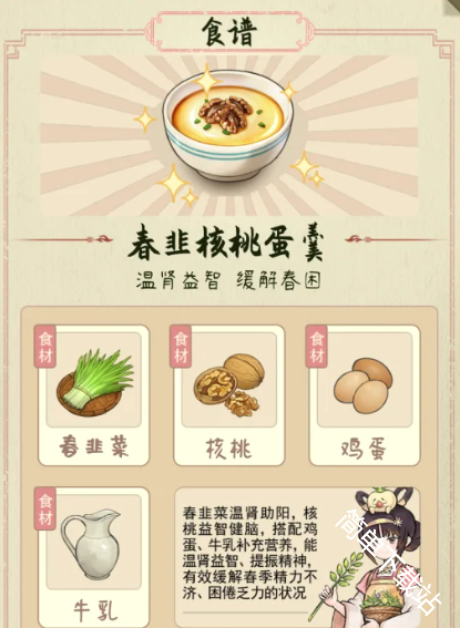 12、春韭核桃蛋羹:春韭菜+核桃+鸡蛋+牛乳