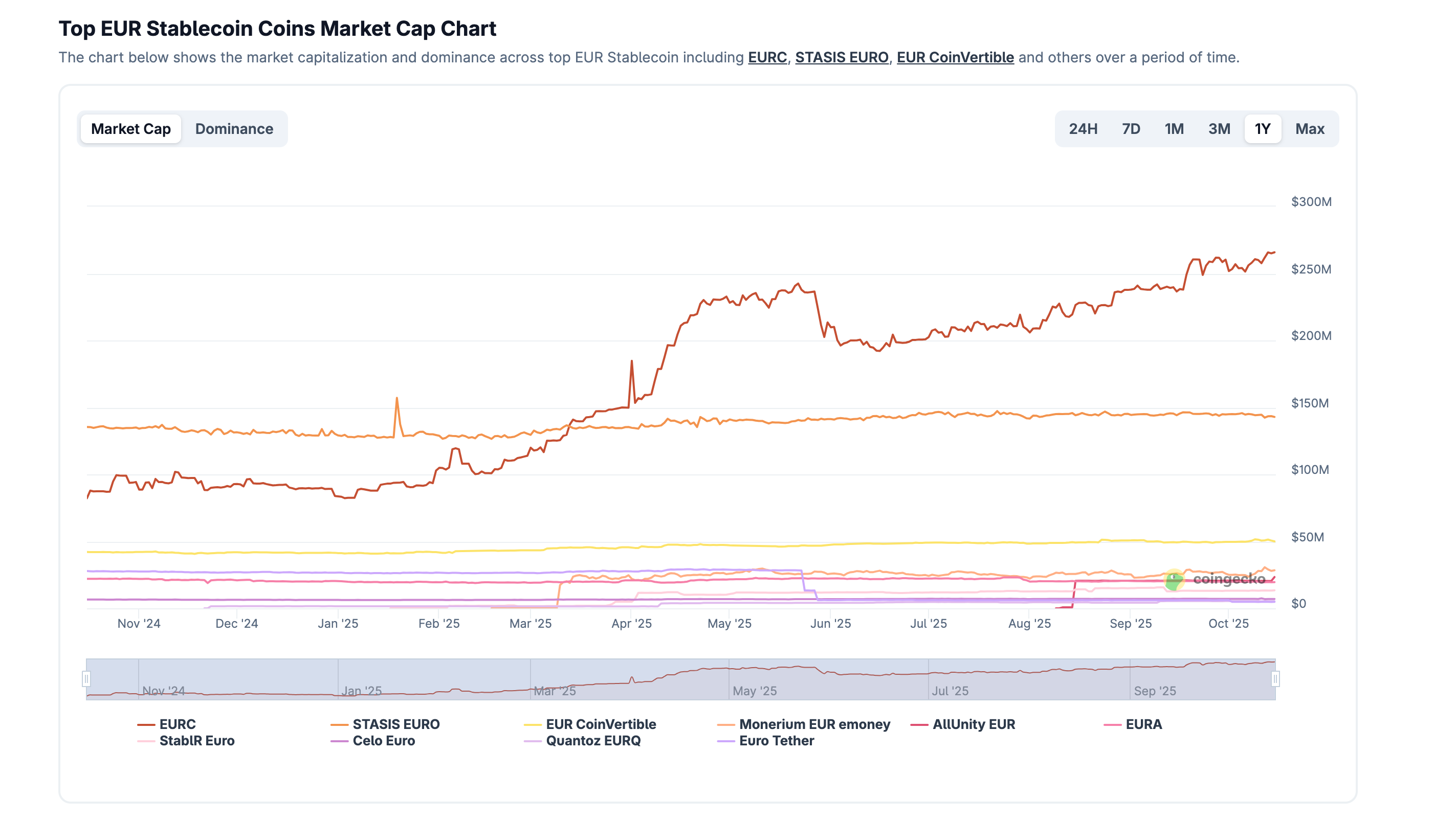 今年欧元稳定币市值已翻倍。CoinGecko数据显示,Circle的EURC以约2.7亿美元市值领跑市场,而法国兴业银行等机构发行的EUR CoinVertible等代币在MiCA框架下需求较低。