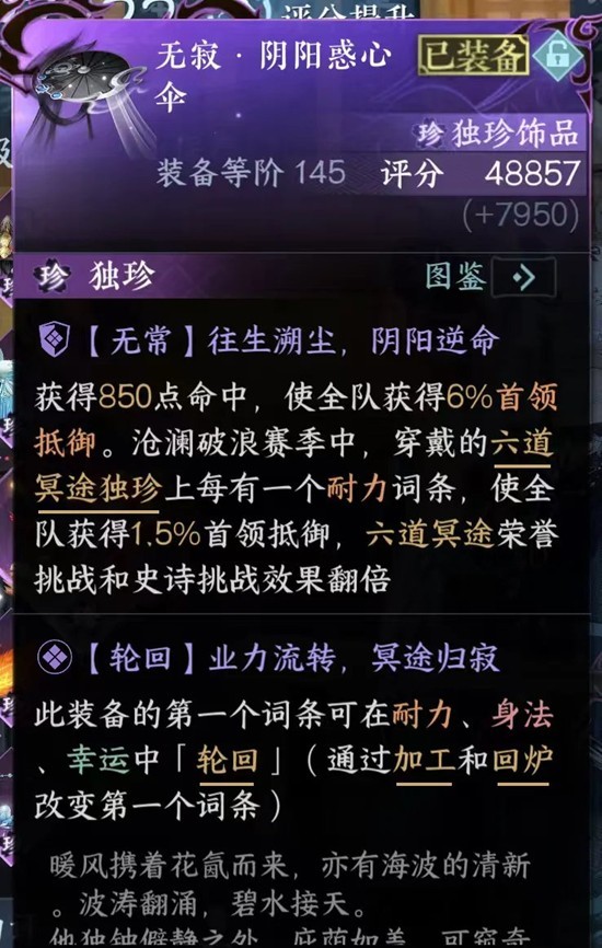 装备推荐,核心装备是老五伞,其他团本独珍只有老四羽毛、老六衣服、老六项链,包括老五伞在内,最多可以有4个可以加工耐力词条的团本独珍,合计6%首领抵御(荣誉/史诗战斗中翻倍),七独珍与否只增加输出,可以不带戒指(七个独珍以上即可激活“定海”)